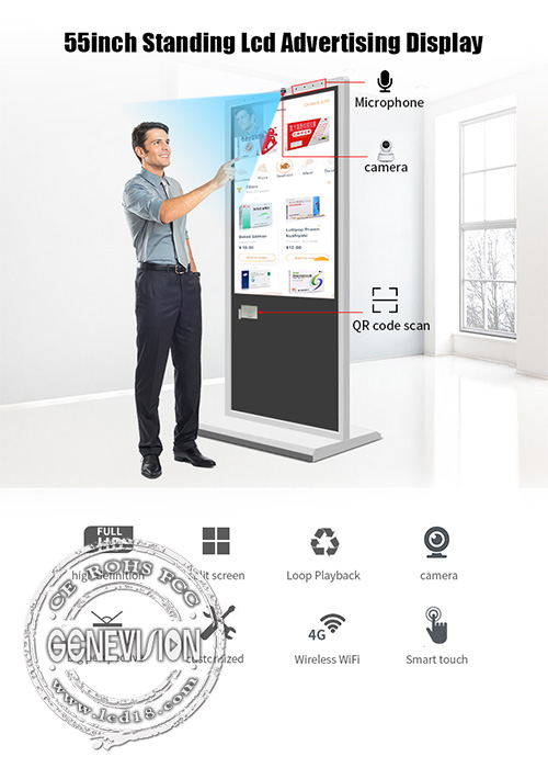 Genevision has full range of foorstanding lcd advertising kiosk on hot sale at cheap price, android operation system with remote control software, hundreds terminals' advertising can be updated remotely via internet, also, advertising can be updated by USB manually, easy to use. Android ad player stand has Wifi and LAN, also, 3G/4G can be inbuilt.Windows all-in-one computer system can also be. CPU can be I3/I5/I7, memory can be 4G/8G/16G, SSD is 64G/128G/256G/1TB. Touch screen is also on option, with fast delivery time of 10days.